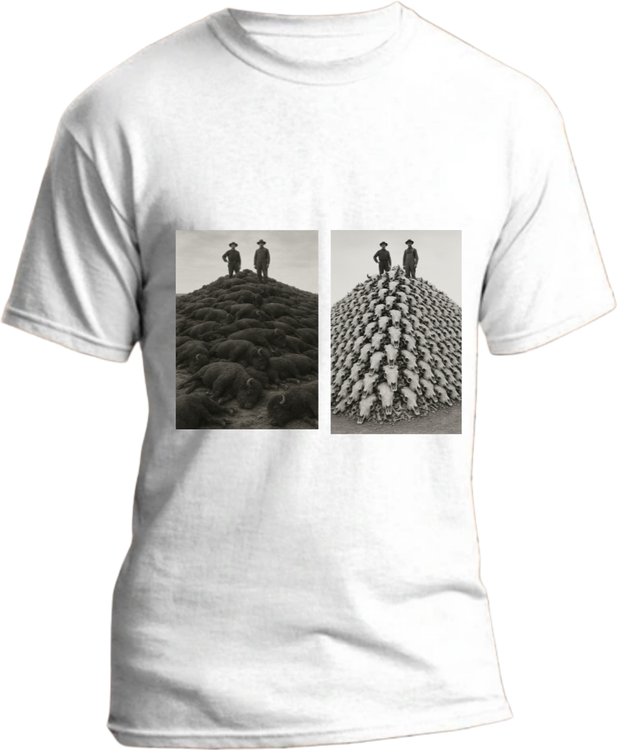 When the colonizers came, they slaughtered the buffalo — not for food, but to erase a people’s way of life. The black tee shows the haunting tower of skulls; the white tee reveals both sides of the kill — the mound of bodies with meat intact, and the pile reduced to nothing but bones. #BisonBlood
